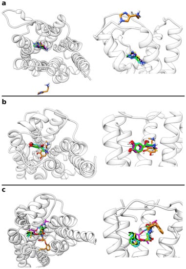 Overlay of all five final cluster structures from the unbiased MD simulations with the reference binding mode (left: top-view, right: zoomed-in lateral view). The ligands are shown as sticks with the carbon atoms of the reference ligand colored in black and those of the cluster structures colored in yellow (most populated), green, cyan, magenta and orange (least populated) according to the color scheme described in Figure 3. (a) Histamine in complex with the H1 receptor, (b) adrenaline, and (c) alprenolol both in complex with the adrenoceptor.