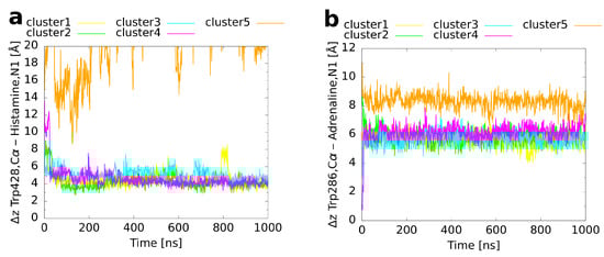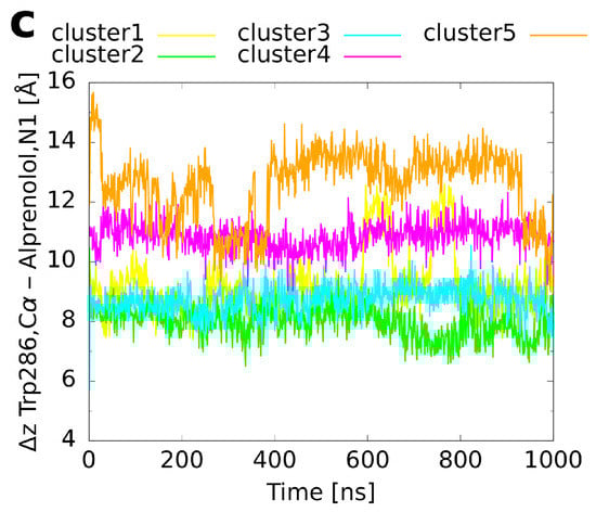 For alprenolol, which was the biggest ligand investigated, only clusters 1–3 converged to the reference binding mode (Figure 5c). Again, as shown for histamine and adrenaline, this happened immediately at the beginning of the respective runs (Figure 6c). In contrast, clusters 4–5 did not reach the same conformation. Cluster 4 remained always a bit farther outside than the reference (Figure 7c, reference 8.2 Å) with the ligand oriented too steep in the binding pocket. Although cluster 5 was the farthest from the orthosteric binding site at the beginning (Figure 3c and Figure 7c), it descended over time showing throughout a pronounced flexibility. However, it twisted eventually and the aromatic ring was trapped in the interface between transmembrane helices 5 and 6 so that it could not converge to the binding mode of the reference.