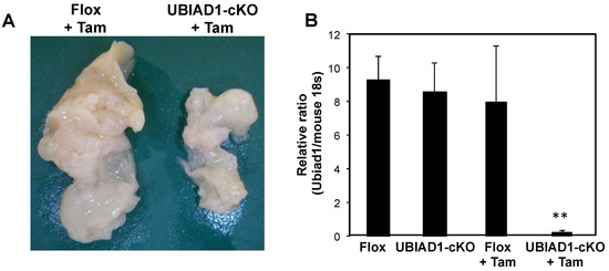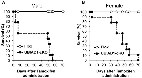 CAG-Cre-ERT+/−UBIAD1fl/fl (UBIAD1-cKO) mice injected with tamoxifen died within 60–70 days of tamoxifen administration. Tamoxifen-treated UBIAD1-cKO male mice died about 60 days after tamoxifen administration, while the female mice died after 70 days (Figure 1).