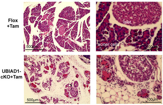 Hematoxylin–eosin (H&E)-stained pancreas sections from female Flox and UBIAD1-cKO mice at 40 days after administration of tamoxifen.