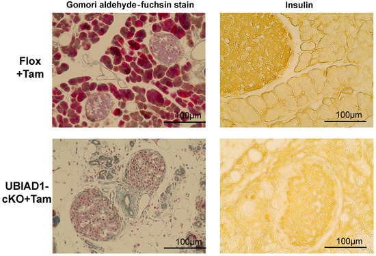 The pancreas of the tamoxifen-treated UBIAD1-cKO mice was remarkably smaller. Tissue sections were prepared, and hematoxylin–eosin (H&E) staining was performed. Pancreatic acinar cells were absent in the tamoxifen-treated UBIAD1-cKO mice; instead, several vacuoles were noted (Figure 3). On the other hand, the presence of internal α, β, and δ cells was confirmed by Gomori aldehyde fuchsin staining (Figure 4). No atrophy of the pancreatic islets of tamoxifen-treated UBIAD1-cKO mice was noted. The pancreas of tamoxifen-treated Flox mice was stained with insulin antibody only in the pancreatic islets, whereas, in tamoxifen-treated UBIAD1-cKO mice, pancreatic islets and portions other than the pancreatic islets were also widely stained (Figure 4). These results indicate that insulin secreted from pancreatic islets is dispersed within the pancreas in tamoxifen-treated UBIAD1-cKO mice.