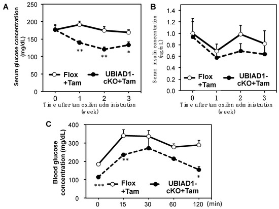 Serum glucose (A) and insulin (B) concentrations in Flox and UBIAD1-cKO mice after tamoxifen administration. Oral glucose tolerance test (C) in tamoxifen-treated Flox and UBIAD1-cKO mice at 40 days after administration of tamoxifen. Serum glucose was assayed at 0, 15, 30, 60, and 120 min. Each point on the curve represents the mean ± SEM. Data are shown as means ± SEM; * p < 0.05 and ** p < 0.01 when compared with the corresponding values at each point in the tamoxifen-treated Flox mice.