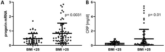 As shown in Figure 2A progerin mRNA levels were significantly upregulated in blood samples of individuals with BMI ≥ 25 kg/m2 (n = 65; 0.46 ± 0.16 vs. 0.83 ± 0.71, p = 0.003) compared to the normal weight group (n = 46). Moreover, patients with BMI ≥ 25 kg/m2 (n = 64) exhibited significantly higher CRP values (Figure 2B) as the normal weight group (n = 46; 0.28 ± 0.24 vs. 0.9 ± 1.33, p = 0.01), indicating a higher activity of systemic inflammation (p = 0.01). Multivariate logistic regression analyses revealed CRP (OR, 3.58 (95% confidence interval, 1.19–10.76); p = 0.02) and progerin mRNA (OR, 3.47 (95% confidence interval, 1.31–9.19); p = 0.012) as independent variables.