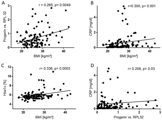 Consistent with the findings above, linear regression analysis showed a positive correlation of BMI and progerin mRNA (Figure 3A) levels in patients’ blood (r = 0.265, p = 0.005). BMI and CRP (Figure 3B) (r = 0.300, p = 0.001) as well as BMI and HbA1c (Figure 3C) (r = 0.336, p = 0.0003) were also significantly positively correlated. Moreover, progerin mRNA levels correlated positively with CRP (Figure 3D) (r = 0.0751, p = 0.42). Using multivariate regression analysis progerin mRNA correlated independently with BMI.