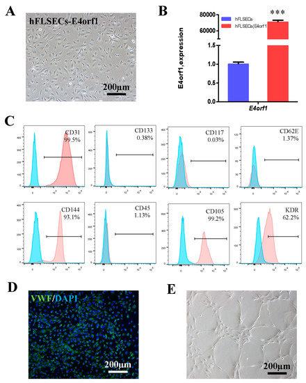 The hFLSECs-E4orf1 were constructed by transduction of the hFLSECs with the recombined retroviral vector MSCV-N E4orf1. Then, the transgenic cells were further purified with 0.5 μg/mL puromycin selection for 3–5 days and sub-cultured in serum-free/proangiogenic factors-free conditions (Figure 1A). To determine the expression of E4orf1 in hFLSECs, a quantitative real-time polymerase chain reaction (qRT-PCR) was used to detect the expression level of E4orf1 mRNA in hFLSECs-E4orf1 or hFLSECs. As shown in Figure 1B, E4orf1 was highly expressed in hFLSEC-E4orf1 feeders but barely in primary hFLSECs. Flow cytometric analysis was used to characterize cell surface markers on the sub-cultured hFLSECs-E4orf1, showing that the hFLSECs-E4orf1 were positive for endothelial cell markers, such as CD31, CD144, CD105 and KDR, but negative for CD133, CD117, CD62E, and CD45 (Figure 1C), which indicates that the cells were free of endothelial progenitor cells or mature blood cells. It is worth mentioning that the membrane marker CD105 was employed for positive selection of LSECs using MACS [30]. The von Willebrand Factor (vWF) expression of HFLSECs was identified by immunofluorescence, which has been generally reported on human endothelium (Figure 1D). In addition, for function analysis, tube formation assay was tested (Figure 1E). The results showed that hFLSECs-E4orf1 plated in Matrigel can form capillary-like structures. In brief, hFLSECs-E4orf1 exhibited a cell-surface expressional profile similar to freshly isolated cells and maintained the primary function. The non-transduced hFLSECs are shown in Supplementary Materials Figure S1A,B as controls.