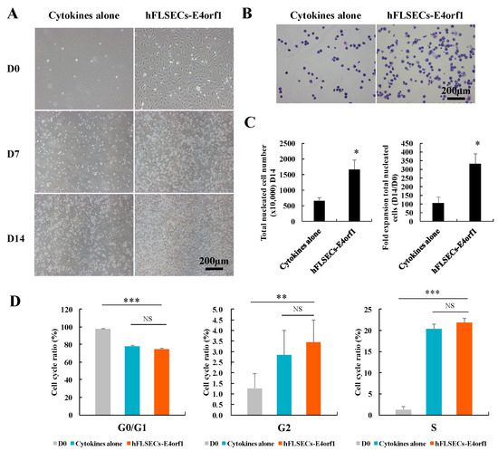 Previous reports have demonstrated that HSPCs’ ex vivo expansion was achieved at the expense of the long-term engrafting HSCs’ (LT-HSCs) loss and even bank exhaustion, which means dilution of the HSC population occurred with the extensive expansion [42]. Interestingly, in this study, although more significant expansion was achieved under coculture condition than in cytokines culture alone, a comparable proportion of cells existed in the G0/G1 phase (Figure 4A), which suggested that the coculture of CD34+ hCB cells with hFLSECs-E4orf1 retained considerable HSCs in steady state to ensure the long-term expansion and multipotency of hematopoietic development.