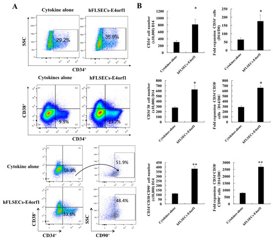 Coculture of hFLSECs-E4orf1 efficiently expanded human CB-HSPCs in vitro. (A) Phenotypic analysis of CD34, CD38, and CD90 expression on CD34+ hCB cells on day 0 and following cytokines culture alone and the hFLSECs-E4orf1 coculture for 14 days. Representative flow cytometry is shown. (B) Total expansion number and fold change of CD34+ cells, CD34+CD38− cells, and CD34+CD38−CD90+ cells. Data represented as mean ± SEM. n = 6. * p < 0.05, ** p < 0.01. (We have established three hFLSEC-E4orf1 cell lines, which have stable and consistent effects on ex vivo expansion of HSPCs.)