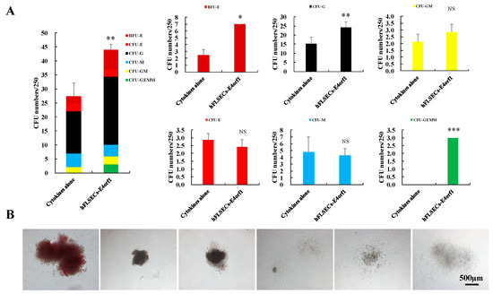 CD34+ hCB cells coculture with hFLSECs-E4orf1 resulted in increased number of CFUs in vitro while having the capacities of repopulating and multilineage differentiation in vivo. (A,B) Count of different colony types of methylcellulose-based clonogenic assay performed on expanded CD34+ hCB cells. Scale bars: 500 μm. Data represented as mean ± SEM. NS means “no significant difference”. n = 6. * p < 0.05, ** p < 0.01, *** p < 0.001.
