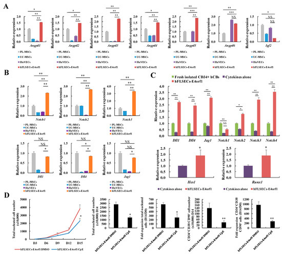 Hematopoietic-related cytokines and Notch signaling molecules contribute to supportive effect of hFLSECs-E4orf1. (A) hFLSECs-E4orf1 express growth factors that support HSC expansion. Comparison of the relative transcript levels of hematopoietic-related genes in hFLSECs-E4orf1, with PL-MSC, UC-MSCs, and HuVECs as controls. (B) Comparison of the relative transcript levels of Notch genes in hFLSECs-E4orf1, with PL-MSCs, UC-MSCs, and HuVECs as controls. (C) Notch signaling pathways are compared among freshly isolated CD34+ hCB cells, CD34+ hCB cells in cytokines alone and those cocultured with hFLSECs-E4orf1 at day 14 (upper panel). The expression of Notch target genes (Hes1, Runx1) are compared between CD34+ hCB cells in cytokines alone culture and those cocultured with hFLSECs-E4orf1 at day 14 (lower panel). (D) Inhibition of Notch signaling influences the effect of hFLSECs-E4orf1 on HSPC expansion. Data represented as mean ± SEM. NS means “no significant difference”. * p < 0.05, ** p < 0.01, *** p < 0.001.