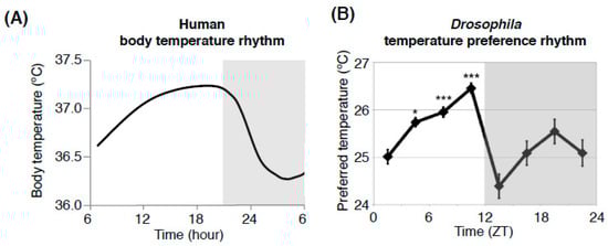 Comparison between the human body temperature rhythm (BTR) and the Drosophila temperature preference rhythm (TPR). The human BTR (A) (replotted the figure using an example form Duffy JF et al. 1998, Figure 3 []) and the Drosophila TPR (B) (modified from Kaneko et al. 2012, Figure 1 []). The shadow area in (A) shows the sleep period, and (B) shows the dark period. ZT: zeitgeber time. *: p < 0.05, ***: p < 0.001 (comparison to ZT 1–3). Given that the body temperature of Drosophila is close to their ambient temperature, the TPR results in fluctuations in body temperature. The TPR shows a rhythmic pattern similar to that of the human BTR.