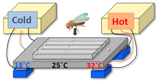 Drosophila temperature preference behavioral assay. A temperature gradient from 18 to 32 °C is generated in a chamber made with a metal plate and a plexiglass cover. Flies are introduced into the chamber through the holes in the cover. Within 30 minutes, the flies settle in the locations with their preferred temperatures. Because their body temperatures are very close to the ambient temperature, their body temperatures can be determined by measuring the temperature in the place where they are located. The diagram is modified from Goda et al. 2014, Figure 3 [].