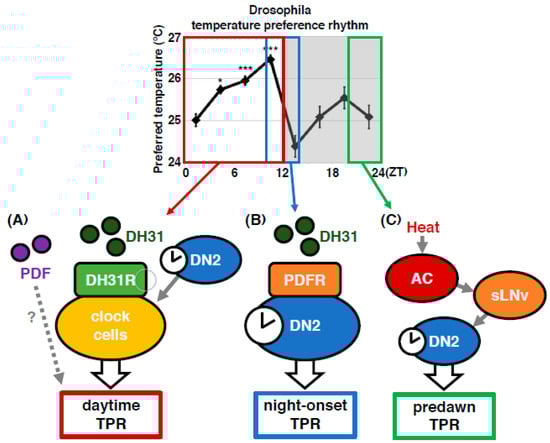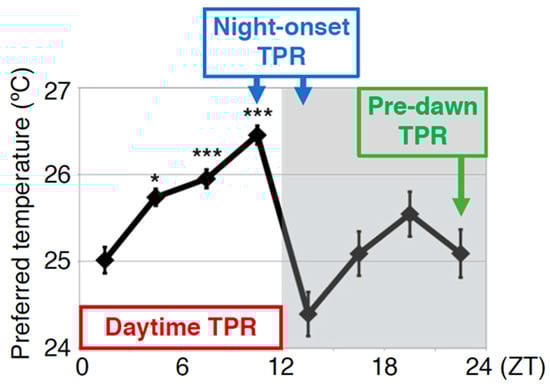 The TPR is regulated by different regulatory mechanisms at different times of the day: daytime, night onset, and predawn. Daytime TPR: The increase in preferred temperature during the daytime (ZT 1–12: shown by the red rectangle). Night-onset TPR: The dramatic decrease in preferred temperature at the transition from day to night (ZT 10–15: shown by blue rectangle). Predawn TPR: The preferred temperature just before dawn is similar to that of early morning (ZT 22–24: shown by green rectangle). The TPR is regulated by different regulatory mechanisms in each of these periods. The graph is modified from Kaneko et al. 2012, Figure 1 []. *: p < 0.05, ***: p < 0.001 (comparison to ZT 1–3).