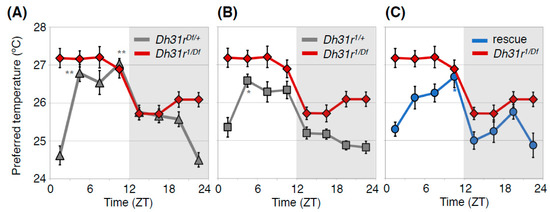DH31R regulates the daytime TPR. Comparison of TPR between Dh31r mutant flies (Dh31r1/Df, red line in (A–C) and heterozygous control flies (Dh31r1/+, gray line in (A) or Dh31rDf/+, gray line in (B)) or Dh31r genomic rescue flies (rescue, blue line in (C)). Dh31r mutant flies show an abnormal daytime TPR, in which they prefer a constant temperature of approximately 27°C during the daytime. The control flies exhibit a normal daytime TPR, in which their preferred temperature increases during the daytime (A,B). Genomic rescue of Dh31r flies restored normal daytime TPR (C). Dh31r1 is a P-element insertion mutant (PBac {WH}Dh31-Rf05546), and Dh31rDf is a deletion mutant [Df(2R) BSC273]. In the Dh31r genomic rescue fly, the Ch321-57F06 BAC clone, which includes the entire Dh31r gene region, is inserted into the genome. The graphs are modified from Goda et al. 2018, Figure 1 []. *: p < 0.05, **: p < 0.01 (comparison to ZT 1–3).