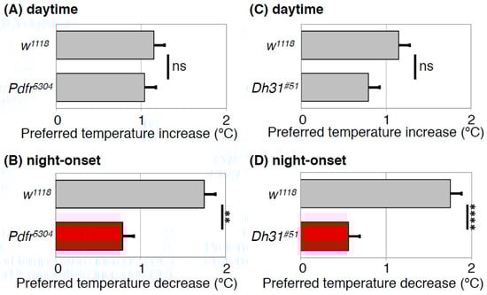 PDFR and DH31 regulate the night-onset TPR. Comparison of daytime TPR (A,C) or night-onset TPR (B,D) between w1118 and Pdfr mutant (Pdfr5304) (A,B) or Dh31 mutant (Dh31#51) (C,D) flies. Both Pdfr5304 and Dh31#51 flies show significantly dampened night-onset TPR (B,D), while both exhibit robust increases in preferred temperature during the daytime (A,C). The data suggest that both PDFR and DH31 are responsible for the night-onset TPR. The graphs are modified from Goda et al. 2016, Figure 1 and Figure 3 []. t-test: **: p < 0.01, ****: p < 0.0001.