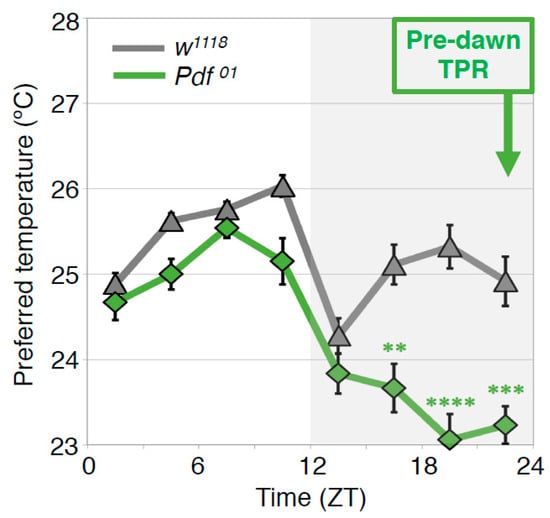 In the wild type flies, the preferred temperature before dawn (ZT22–24) is similar to that of early morning at ZT1-3 (predawn TPR). To understand the mechanisms of the predawn TPR, we first focused on the PDF neurons because they regulate morning anticipation in locomotor activity rhythms; Pdf mutant flies show a lack of morning anticipation, a phenomenon that is manifested as an increase in locomotor activity before dawn []. Therefore, we asked whether PDF is involved in regulating TPR before dawn. We found that Pdf mutant flies preferred a lower nighttime temperature (ZT 16–24) than wild-type flies (Figure 6) []. A similar phenotype was observed in the flies whose PDF neurons were inhibited by expressing the mammalian inward rectifier K+ channel Kir2.1 []. These data suggest that PDF neurons play an important role in regulating the predawn TPR.