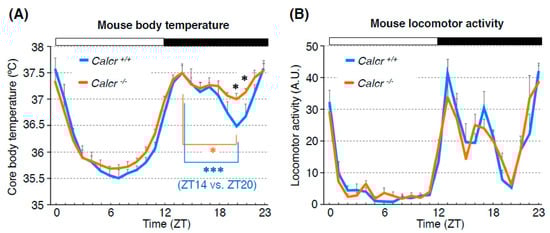 Calcr contributes to body temperature regulation during the night (the active phase for mice). Mouse BTR (A) and locomotor activity rhythm (B) in control (Calcr+/+: blue line) and Calcr knockout (Calcr−/−: orange line) mice. The body temperatures of wild-type mice showed a deep trough at midnight, whereas the body temperatures of Calcr knockout mice lost the characteristic trough and remained relatively unchanged during the night (A). The locomotor activity rhythm in Calcr knockout did not show a significant difference from that of the control, suggesting that Calcr is responsible for mammalian body temperature regulation but not locomotor activity rhythm during the night (the active phase for mice). White and black bars on the graphs indicate the 12-h light and dark phases. The graphs are modified from Goda et al. 2018, Figure 6 []. *: p < 0.05, ***: p < 0.001.