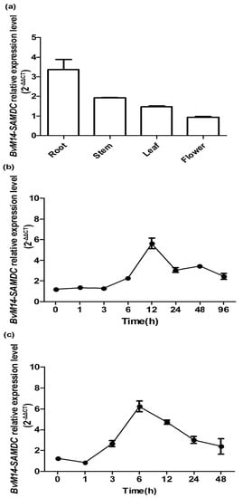 To analyze tissue expression patterns of BvM14-SAMDC, real-time quantitative PCR was conducted using RNA extracted from in roots, stems, flowers and leaves of the M14 line. As shown in Figure 2a, BvM14-SAMDC was ubiquitously expressed in different organs, with roots showing higher levels than other organs (Figure 2a). Furthermore, to determine the response of BvM14-SAMDC to salt stress, the expression patterns of BvM14-SAMDC were analyzed in roots and leaves under 400 mM NaCl treatment and sampled at different time points. After salt stress, the increasing BvM14-SAMDC transcript level appeared much earlier in the M14 roots than in leaves (Figure 2b,c). The maximum levels of BvM14-SAMDC expression were observed at 6 and 12 h in roots and leaves, respectively, under salt stress. The results showed that BvM14-SAMDC transcription was significantly induced in roots and leaves by salt stress. Therefore, it is reasonable to speculate that BvM14-SAMDC participates in regulating plant salt stress tolerance.