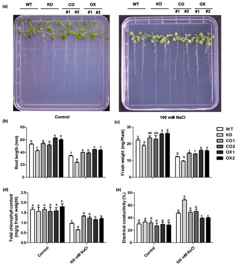 Effect of salt stress on seedling growth phenotype, root length, fresh weight, chlorophyll and electrical conductivity in wild type (WT), BvM14-SAMDC-overexpressed in wild type Arabidopsis (OX), atsamdc1 mutant (KD) and transgenic BvM14-SAMDC in the mutant seedlings (CO) leaves. (a) 8-day-old WT and transgenic seedlings, grown on MS medium, were transferred to new MS solid agar plates supplemented with 0 or 100 mM NaCl, followed by growth for 10 days; (b) root length; (c) fresh weight; (d) chlorophyll level; and (e) electrical conductivity in control and 100 mM NaCl treated seedlings. Different letters indicate significantly different at P < 0.05. Three biological replicates were performed.
