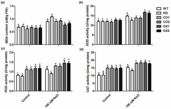 To determine how overexpression of BvM14-SAMDC affects the plant salt stress tolerance, malondialdehyde (MDA) content and antioxidant enzyme activities were determined in WT and the transgenic lines (Figure 4). Under stress conditions, MDA content was increased in all the genotypes (Figure 4a). However, the MDA level was dramatically higher in the KD mutant plants than transgenic or WT plants. In addition, BvM14-SAMDC overexpression plants (OX) showed lower MDA content than the WT and KD line under salt stress. Our results indicate that overexpressing BvM14-SAMDC could reduce the level of lipid peroxidation, which is tightly regulated by enzymes involved in ROS-detoxifying pathways. Therefore, we examined the activities of superoxide dismutase (SOD), catalase (CAT) and peroxidase (POD) (Figure 4b–d). After salt stress, the activities of SOD increased by 23.9%, 5.2% and 30.9% in WT, KD and OX1 lines, respectively. Moreover, the activities of SOD, CAT and POD in the leaves or roots of OX lines were significantly higher than WT or the mutant under control and salt stress conditions (Figure 4b–d and Figure S3). Overall, these results suggest that reduction of MDA can be attributed to the increased activities of ROS-detoxifying enzymes in the transgenic plants.