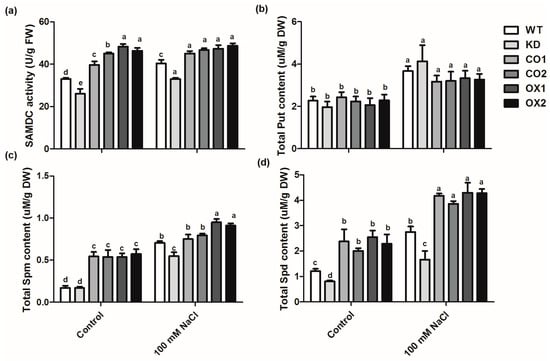 As to the overall SAMDC activities in Arabidopsis, the SAMDC activity of mutant line (KD) was 21.2% and 18.1% lower than that of WT under control and salt stress conditions, respectively. In contrast, the complementation line (CO) exhibited higher SAMDC activity than the wild type (Figure 5a). As expected, the SAMDC activity in OX1 line was 1.46 times higher than that of WT under control conditions. Since SAMDC plays an important role in PA synthesis, polyamines were measured in the transgenic plants in comparison with WT and the mutant lines (Figure 5b–d). Our result indicates that the Put level showed no difference between the WT and transgenic plants, but the Spd and Spm levels were significantly elevated in the transgenic plants. Furthermore, Spd and Spm contents in the mutant line were dramatically lower than the transgenic or WT plants. Clearly, the synthesis of Spd and Spm was improved by overexpressing the BvM14-SAMDC.