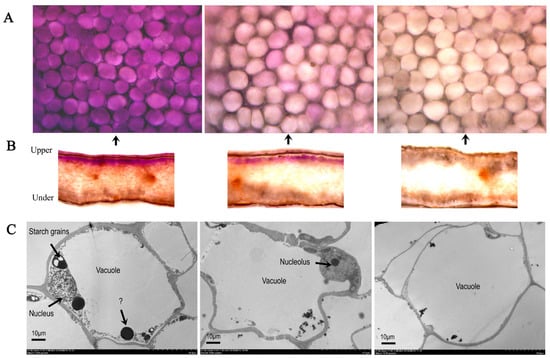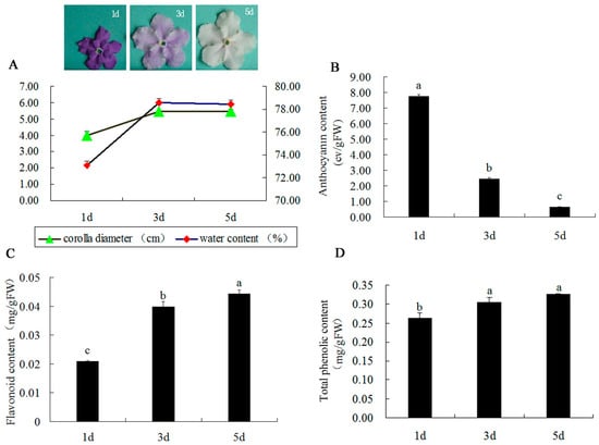 2.1. Changes in Corolla Diameter, Content of Water, Anthocyanin, Flavonoid, Total Phenolic, and Ultra-Structure during Flower Development