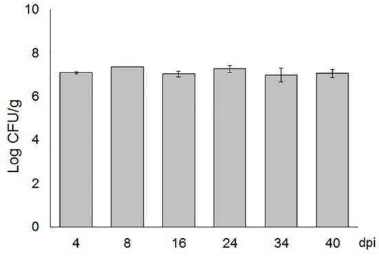 To evaluate T. asperellum spore viability in the growing substrate, CFUs were quantified several days after application. As shown in Figure 1, approximately 1 × 107 CFU/g soil remained at 4 dpi, and those levels were maintained throughout the experiment (40 days), indicating an optimal retention and survival of T. asperellum in the solid matrix. Moreover, this formulation showed a ten-fold higher biomass production of Trichoderma inoculum than the bentonite-vermiculite formulation employed with T. harzianum []. A possible explanation for this logarithmical difference may be due to the formulation pH. According to Singh [], T. asperellum produces high biomass at pH 7.0 with a slow preference at pH 5.5. In our study, the pH recorded in the kaolin was 5.9, suggesting that an acidic milieu positively influences spore production.