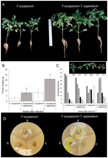 The effectiveness of T. asperellum as a biocontrol agent was evaluated by recording the disease symptoms induced by F. oxysporum (Figure 2). Two-week-old plants were planted in the T. asperellum-solid formulation or mock, and three weeks after were inoculated with F. oxysporum. The plants were grown for three weeks post-inoculation (wpi) before disease symptoms assessment. Less severe disease symptoms caused by F. oxysporum were recorded in T. asperellum-inoculated plants than in untreated plants. Symptoms included wilting and stunting (Figure 2A). This result was concordant with the reduction in fresh-weight loss triggered by fungal pathogen infection in T. asperellum-inoculated plants in reference to non-pretreated plants (Figure 2B).