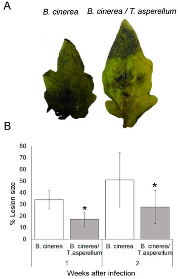 Trichoderma asperellum reduces Botrytis severity on tomato plants. (A) Detached leaves from non- and inoculated plants with T. asperellum were infected with 5 mm-diameter plugs of B. cinerea. Photographs were taken two weeks after infection. (B) Lesions were measured using Image J software 1 and 2 weeks after Botrytis infection. Asterisks indicate significant differences among treatments at a given time (p ≤ 0.05), error bars indicate SEM.