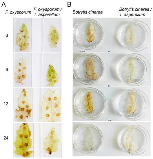 ROS production is an early event during plant defense responses triggered by pathogens attack. In this context, the effect of T. asperellum on ROS accumulation was investigated in tomato leaves infected with F. oxysporum and B. cinerea in the first 24 h (Figure 4A,B, respectively). ROS production was recorded three weeks after inoculation of tomato plants with T. asperellum.