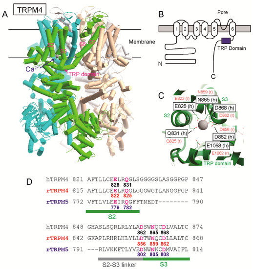 The position of a Ca2+-binding site of TRPM4 had been unknown for a long time since its cloning. However, as a result of site-directed mutagenesises and patch clamp analyses of rat TRPM4 (rTRPM4), we previously found that negatively charged amino acid residues near and in the TRP domain of the intracellular C-terminal tail are necessary for the normal Ca2+-sensitivity of rTRPM4 [6]. They are Asp1049 and Glu1062 of rTRPM4 and are conserved in the other Ca2+-sensitive TRPM channels (TRPM5, TRPM2 and TRPM8) [6,7,8]. More recently, several cryo-electron microscopy (cryo-EM) structures of TRPM4 were reported [9,10,11,12]. One of them is a Ca2+-bound structure of human TRPM4 (hTRPM4, [11]). Ca2+ was surrounded by four amino acid residues of the transmembrane segment 2 (S2) and 3 (S3) (Glu828, Gln831, Asn865, and Asp868 of hTRPM4) within a cavity accessible from cytosol (Figure 1, [11]). The glutamate in the TRP domain, which we reported, was located at the entrance of the cavity and assumed to enhance access of Ca2+ to the Ca2+-binding site through its negative charge (Figure 1, [9,11]). The cryo-EM structures of TRPM2 [13,14] and TRPM8 [15] supported that the four amino acid residues in S2 and S3 form their Ca2+-binding sites.