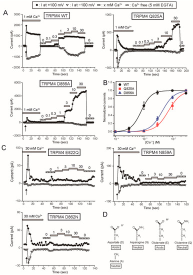 Mutations of the amino acid residues of the proposed Ca2+-binding site of rTRPM4 reduced the Ca2+-sensitivity. (A) Typical time courses of the changes in the currents at +100 mV (filled circles) and −100 mV (open inverted triangles) of wild-type (WT) rTRPM4, Q825A and D856A. After the current amplitudes became almost steady in the presence of 1 mM intracellular Ca2+ (Ca2+i), Ca2+i concentrations ([Ca2+]i) were varied from 0 mM (chelated with 5 mM EGTA) to 30 mM. Arrows indicate the time of the patch excision. (B) Concentration-response curves (CRCs) for the effect of Ca2+ on WT TRPM4 (black circles), Q825A (red squares, and D856A (blue triangles). Current amplitudes at +100 mV were used for analyses. The shifts of CRCs by the mutations seemed to be underestimated, because the CRCs were drawn on the assumption that the current amplitudes at 30 mM Ca2+i were maximal but their current amplitudes at 30 mM Ca2+i were actually not saturated. (n = 7 or 8, each). (C) Typical time courses of the currents at +100 mV (filled circles) and −100 mV (open inverted triangles) of E822Q, N859A and D862N. Patch membranes were excised in the presence of 30 mM Ca2+i. Similar results were obtained repeatedly (n = 6 each). (D) Chemical structures of side chains of the amino acid residues which were mutated in this study.