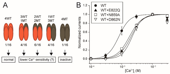 The Ca2+-sensitivities of E822Q, N859A or D862N were unable to be precisely estimated because there were no currents after their desensitization (Figure 2C). Therefore, as another approach in examining whether these mutations reduced the Ca2+-affinity of rTRPM4, we evaluated the effects of co-expression of E822Q, N859A or D862N on the Ca2+-sensitivity of WT rTRPM4. Firstly, we explain our working hypothesis. When the tetramers of rTRPM4 are formed only by these mutants, the channels were almost inactive as already shown in Figure 2C. If the Ca2+-affinities of these mutants are lower than that of WT rTRPM4, the heteromer channels which are formed by WT and mutant TRPM4 will show the Ca2+-sensitivities lower than that of WT rTRPM4 homomers (Figure 3A, middle). Stochastically, the majority of the tetramers will be the heteromers (14/16, 87.5%). When WT rTRPM4 and these mutants are co-expressed, the currents are expected to be the mixture of WT rTRPM4 homomer currents and heteromer currents. Therefore, the co-expressed currents may exhibit rightward-shifted CRCs in comparison with that of solely expressed WT rTRPM4. As shown Figure 3B, the co-expression of E822Q, N859A or D862N shifted the CRCs for the effect of Ca2+ on WT rTRPM4. EC50 for Ca2+ of the co-expressed WT and E822Q currents, the co-expressed WT and N859A currents, and the co-expressed WT and D862N currents were 2.00, 1.78 and 2.19 mM, respectively. These results also suggest that the mutations of amino acid residues at the deep position of the proposed Ca2+-binding site reduced the Ca2+-affinity of rTRPM4.