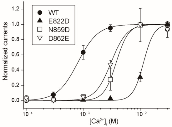 In order to further confirm that Glu822, Asn859 and Asp862 participate in forming the Ca2+-binding site of rTRPM4, we examined the influence of the mutations of these amino acid residues to negatively-charged amino acid residues. Glu822 and Asp862 were mutated to aspartate (E822D and N862D). Asp862 was mutated to glutamate (D862E). Although the negative charge of the residues remained in E822D and D862E or was added in N862D, the Ca2+-sensitivities of the mutants were lower than that of WT rTRPM4 (Figure 4). EC50 for Ca2+ of E822D, N859D and D862E currents were 11.5, 3.80 and 3.09 mM, respectively. Although there had been also a possibility that these mutations would rather increase the Ca2+-sensitivity, actually their Ca2+-sensitivities were reduced by the mutations. These results also indicate that Glu822, Asn859 and Asp862 participate in forming the Ca2+-binding site of rTRPM4. Additionally, these results suggest that the combination of these amino acid residues in WT rTRPM4 is the best for forming a high-affinity Ca2+-binding site, and the changes in the length of these side chains and in the number of negative charges impaired the Ca2+-affinity of the Ca2+-binding site.