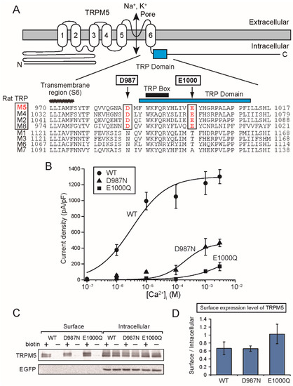 Next, we examined the effects of mutations of the negatively-charged amino acid residues near and in the TRP domain on the Ca2+-sensitivity of rTRPM5 (Figure 5A). Corresponding amino acid residues of hTRPM4, rTRPM4 and rTRPM5, which were mutated in this study, are summarized in Table 1. Asp987 is located immediately before the TRP domain and was mutated to asparagine (D987N). Glu1000 is located in the TRP domain and was mutated to glutamine (E1000Q). As TRPM5 was inhibited by Zn2+ [17], Zn2+-sensitive currents were analyzed as rTRPM5 currents. Typical whole-cell currents are shown in Supplementary Figure S3B,C. The effects of different [Ca2+]i was evaluated by using pipette solutions which contained different free Ca2+ concentrations. Similar to our previous report concerning rTRPM4 [6], the mutations of the aspartate and the glutamate (D987N, E1000Q) reduced the Ca2+-sensitivity of rTRPM5 (Figure 5B). The mutations did not reduce the surface expression of rTRPM5 (Figure 5C,D).