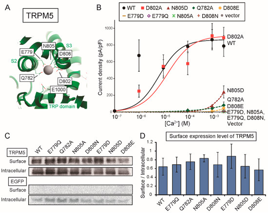 We then examined the effects of mutations of the amino acid residues of the proposed Ca2+-binding site on the Ca2+-sensitivity of rTRPM5. As no three-dimensional structures of TRPM5 are available, corresponding amino acid residues of rTRPM5 are labeled on the structure of hTRPM4 [11] in Figure 6A. The four amino acid residues (Glu779, Gln782, Asn805, and Asp808) seem to contact with Ca2+, and the aspartate (Asp802) seems to not contact with Ca2+. They were mutated to alanine (Q782A, D802A and N805A), neutral amino acid residues (E779Q and D808N) or acidic amino acid residues (E779D, N805D and D808E). Firstly, only D802A mutation did not shift CRC so much in comparison with that of WT rTRPM5 (Figure 6B), although the mutation of the corresponding amino acid residue of rTRPM4 (D856A) shifted its CRC obviously (Figure 2B). All the other mutations severely impaired the sensitivity of rTRPM5, and many mutants (E779Q, E779D, N805A and D808N) were completely inactive even in the presence of 3 mM Ca2+i (Figure 6B). We were unable to measure whole-cell currents in the presence of 10 mM Ca2+i because the membrane of the cells became fragile under the condition. Biotinylation assays revealed that these mutations did not reduce surface expression levels of the mutant rTRPM5 (Figure 6C,D). These results indicate that the four amino acid residues, which were proposed to form the Ca2+-binding site of TRPM4, also form the Ca2+-binding site of rTRPM5. Additionally, it was also suggested that the aspartate at the entrance of the site (D802) does not play an important role in determining the Ca2+-sensitivity of rTRPM5 in comparison with the case of rTPRM4.