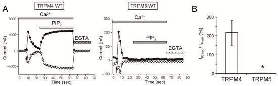 Transient receptor potential melastatin member 4 (TRPM4) and member 5 (TRPM5) channels are Ca2+-activated nonselective monovalent cation channels. They share 40% homology in their amino-acid sequences, so that they are the closest homologs among eight members of the TRPM family [1]. TRPM4 is expressed in a broad range of cells such as cardiac myocytes, immune cells, etc. [1]. Conversely, TRPM5 is expressed in a relatively small number of tissues with the highest expression in type II taste cells, which detect bitter, sweet and umami stimuli [1]. The activities of TRPM4 and TRPM5 influence the functions of the cells, where they are expressed, by depolarizing the membrane potential when they open by a rise in intracellular Ca2+ (Ca2+i) concentration ([Ca2+]i). The Ca2+-sensitivity of TRPM4 has been reported to be maintained by interaction with PI(4,5)P2, a major phosphoinositide in plasma membrane [2], and a depletion of PI(4,5)P2 caused desensitization of TRPM4 [3,4]. PI(4,5)P2 was also reported to have partially restored TRPM5 channel activity after its desensitization [5]. However, their opening is completely dependent on Ca2+i because without Ca2+ they are unable to open even if there is a sufficient amount of PI(4,5)P2 [4,6].