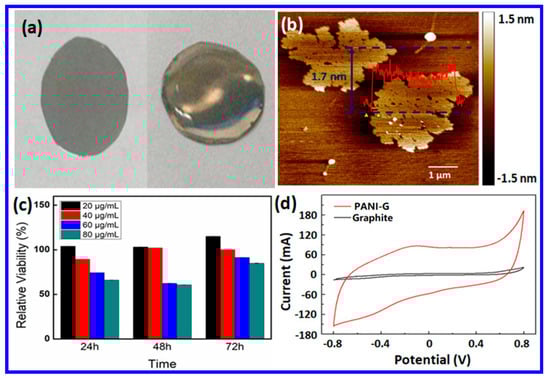 (a) Digital photo of the flexible ITO film (left), compared to the PANI-G coated ITO film; (b) AFM micrograph of the as-prepared PANI-G.; (c) CCK-8 results of the PA PANI-G treated PC-12 cells; (d) Cyclic voltammograms of the PANI-G coated on the glassy carbon electrode, compared to the pristine graphite treated by ball milling under identical conditions. The error bars in (c) are too small to be visible since the difference between various groups was very small. The presence of error bars can be seen in Figure S5 which magnified the corresponding parts of (c).
