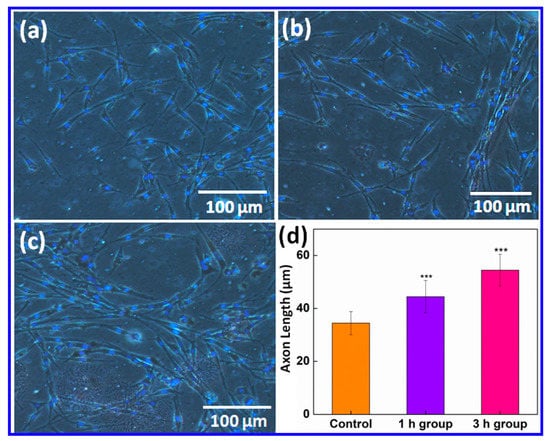Microscopy images of (a) the control; (b) the PC12 cells after electrical stimulation for 1 h per day, over 5 days; (c) the PC12 cells after electrical stimulation for 3 h per day, over 5 days; and (d) changes to the average axon length of PC-12 cells after electrical stimulation (*** p < 0.001).