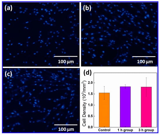 Immunofluorescence micrograph of DAPI-stained PC12 cells. (a) The control; (b) the PC12 cells after electrical stimulation for 1 h per day, repeated 5 days; (c) the PC12 cells after electrical stimulation for 3 h per day, repeated 5 days; and (d) changes in the cell density of PC-12 cells after electrical stimulation (p > 0.05).