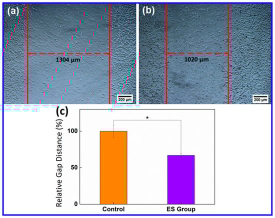 Microscopy images of the wound healing assay of (a) the control and (b) the PC12 cells after electrical stimulation. (c) Relative gap distance comparison between the control and the electrical stimulation group (* p< 0.05).