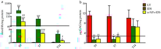 After 7 days, the supplemented medium was removed and cells lysed at 0, 7, and 14 days post-treatment. The in vitro evaluation confirmed the ability of NPs to encapsulate IDS and to transport it into the fibroblasts, preserving its activity. Although cells treated with the u-NPs-IDS presented a lower induced enzyme activity compared to cells treated with free IDS (Figure 1a), such an induced activity reached the level normally measured in healthy control cells and it was sufficient to reduce the GAG content of the cells to non-pathological levels (Figure 1b).