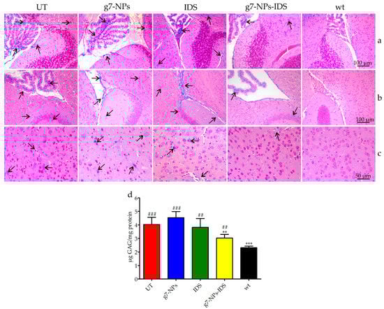 Analysis of GAG in the brain of treated Ids-ko mice. Histochemical and biochemical analysis of GAG in the brain of Ids-ko mice treated with 0.9% NaCl (untreated, UT), g7-NPs, free IDS, g7-NPs-IDS, and in wt mice, after 6 weeks of treatment. Representative sections of the brain storages in (a) cerebellum with the fourth ventricle, (b) hippocampus with the third ventricle, and (c) cerebral cortex. Arrows indicate GAG deposits. Sections (7 μm) were stained with 1% Alcian Blue pH 2.5, counterstained with 0.1% Nuclear Fast Red. (d) GAG content (μg GAG/mg protein) detected in the brain parenchyma after 6 weeks of treatment (n = 5 per treatment group). All values are represented as mean ± SD. Asterisks indicate a statistically significant difference from UT mice (Mann–Whitney U test, ** p < 0.01, *** p < 0.001); hash marks indicate a statistically significant difference from wt mice (Mann–Whitney U test, ## p < 0.01, ### p < 0.001).