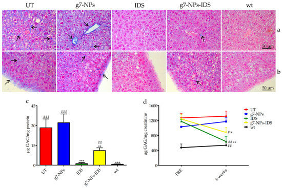 Analysis of GAG in the liver and urine of treated Ids-ko mice. Histochemical and biochemical analysis of GAG in liver and urine of Ids-ko mice treated with 0.9% NaCl (untreated, UT), g7-NPs, free IDS, g7-NPs-IDS, and in wt mice, after 6 weeks of treatment. Representative sections of (a) hepatic vessels and (b) Glisson’s capsule. Arrows indicate GAG deposits. Sections (7 μm) were stained with 1% Alcian Blue pH 2.5, counterstained with 0.1% Nuclear Fast Red. (c) GAG content (μg GAG/mg protein) detected in the liver after 6 weeks of treatment (n = 5 per treatment group). Data are mean ± SD. Asterisks indicate a statistically significant difference from UT mice (Mann–Whitney U test, * p < 0.05, ** p < 0.01, *** p < 0.001); hash marks indicate a statistically significant difference from wt mice (Mann–Whitney U test, ## p < 0.01, ### p < 0.001). (d) Urinary GAG content (µg GAG/mg creatinine) detected just before the start of treatment (PRE) and after 6 weeks of treatment (6 weeks) (n = 5 per treatment group). All values are represented as mean ± SD. Asterisks indicate a statistically significant difference between the same treatment-group before starting (PRE) and after 6 weeks of treatment (Mann–Whitney U test, *** p < 0.001); hash marks indicate a statistically significant difference of the samples obtained from mice after 6 weeks of treatment vs. age-matched UT mice (Mann–Whitney U test, # p < 0.05, ## p < 0.01).