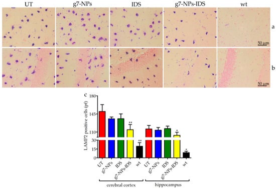 The increase/reduction of glycosaminoglycan storage within lysosomes can be indirectly assessed through the analysis of lysosomal membrane proteins; therefore sections of paraffin embedded-brains were stained by using the lysosomal associated membrane protein 2 (LAMP2) antibody (Figure 4a,b). As shown in the panel, positive lysosomal signals were detected both in the cerebral cortex (Figure 4a) and in the hippocampus (Figure 4b) of all Ids-ko mice. The number of cells positive to LAMP2 (Figure 4c) showed a significant tendency to decrease in the cerebral cortex and in the hippocampus of the animals treated with g7-NPs-IDS (respectively 24% and 10% vs. UT mice, with p < 0.01 and p < 0.05), consistently with the data obtained from the biochemical and histological/immunohistochemical analyses of GAG. As expected, no significant decreases were observed in mice treated with g7-NPs and free IDS.