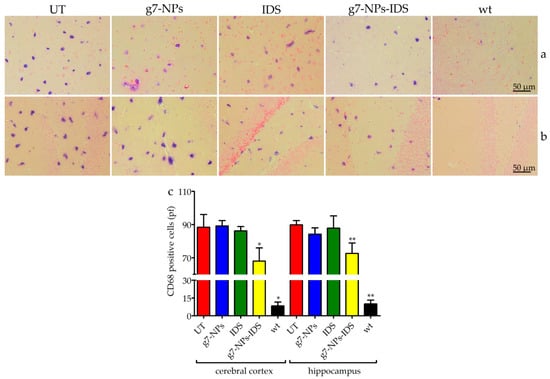 Immunohistochemical analysis of CD68 in the brain. Immunohistochemical analysis of CD68 in Ids-ko mice treated with 0.9% NaCl (untreated, UT), g7-NPs, free IDS, g7-NPs-IDS, and in wt mice, after 6 weeks of treatment. Representative images of (a) cerebral cortex and (b) hippocampus of 7 µm sections stained with CD68 antibody (purple spots) and counterstained with 0.5% Eosin Y solution. (c) Quantification of positive cells to CD68 in the cerebral cortex and hippocampus. n = 5 mice/group, pf = per field. All data are mean ± SD. Asterisks indicate a statistically significant difference from UT mice (Mann–Whitney U test, * p < 0.05, ** p < 0.01). All Ids-ko mice groups presented a statistically significant difference from wt mice.