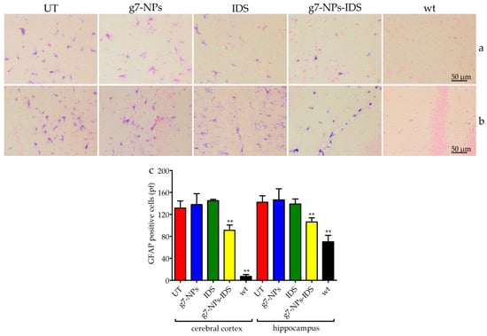Immunohistochemical analysis of GFAP in the brain. Immunohistochemical analysis of GFAP in Ids-ko mice treated with 0.9% NaCl (untreated, UT), g7-NPs, free IDS, g7-NPs-IDS and in wt mice, after 6 weeks of treatment. Representative images of (a) cerebral cortex and (b) hippocampus of 7 µm sections stained with GFAP antibody (purple spots) and counterstained with 0.5% Eosin Y solution. (c) Quantification of positive cells to GFAP in the cerebral cortex and hippocampus. n = 5 mice/group, pf = per field. All data are mean ± SD. Asterisks indicate a statistically significant difference from UT mice (Mann–Whitney U test, ** p < 0.01). All Ids-ko mice groups presented a statistically significant difference from wt mice.