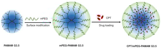 Therapeutic agents in chemotherapy are known to have side effects, ranging from mild to severe, in normal and non-targeted tissues without a proper delivery mechanism. Herein, PAMAM dendrimer, especially half-generation dendrimer, was chosen for its aforementioned advantages of pre-determined and controllable structure, presence of cavities and compartments for CPT encapsulation, and lack of positive charge-induced toxicity as in full generation dendrimer. Moreover, the carboxyl ends at the outermost of the half generation dendrimer are readily reactive to the amine-terminated mPEG, which is a widely used accessory molecule in drug delivery systems thanks to its comprehensive benefits (Figure 1). Theoretically, conjugation of mPEG can improve our system’s capacity of drug loaded and control pre-mature drug leakage from the particles while traveling to the target site, which are demonstrated through the following results.