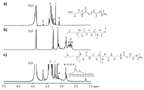 1H-NMR spectrum (D2O, δ in ppm) of (a) mPEG-NH2, (b) polyamidoamine (PAMAM) G3.5, and (c) mPEG-G3.5 dendrimer.