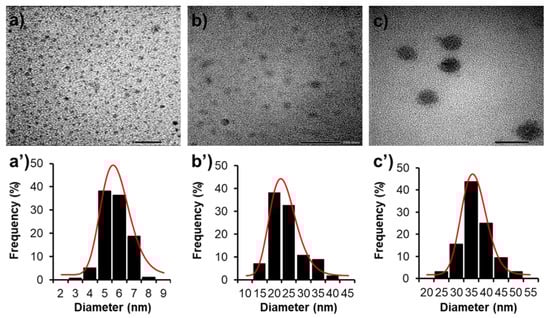 (a–c) Transmission electron microscopy micrographs and (a’–c’) size distribution of G3.5, mPEG-G3.5, and CPT/mPEG-G3.5 (respectively), fitted by log-normal distribution function (red line). Scale bar for a–c are 20, 200, and 50 nm, respectively.