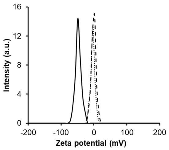 Apart from particle size, surface charge is another parameter frequently used in characterizing of nanocarriers. Cationic charged particles have been found triggering non-specific interactions with cell membranes or opsonizing proteins owing to electrostatic bindings, which can result in unexpected cytotoxicity [31]. Moreover, various in vivo studies have associated more negative zeta potential with higher clearance rate from the blood, possibly also due to undesirable bindings with opsonizing proteins [45,46,47]. Thus, less negatively charged or almost neutral particles may be considered more rational [48]. Figure 5 illustrates the zeta potentials of the proposed particles, uncoated, PEG-coated, and CPT-loaded. As can be seen, naked PAMAM G3.5 had a deeply negative charge of −50.07 mV, which was to be expected since half generated dendrimers are coated with negatively charged carboxylate groups. However, after being coated with PEG, the surface charge increased to nearly neutral (1.49 mV). The reason for this increase could be due to the capping of PEG over the carboxylate groups, which in a sense further proves the conjugation of PEG. The zeta potential of the final product, CPT/mPEG-G3.5, did not show any significant difference from the previous value (1.32 mV). The near to neutral surface charge not only lessens the chance of toxicity caused by high cationic charge but also prevents premature clearance of the carriers.